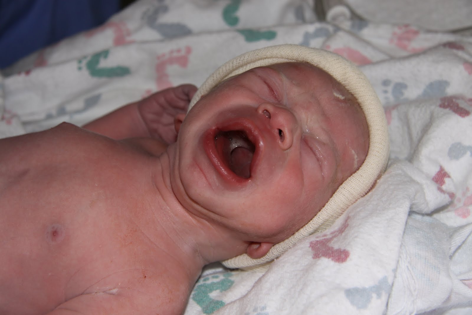 Around 10a Dr. Sharp was there, such a relief, and I was dilated at an 8. Wow I was getting close. He said another hour or two and we will be there, and he was right. Just after 12 noon, I told Ryan we need to get Dr. Sharp in here because I feel like I need to push. Sure enough I was ready to push. I could feel Crew's head on my right side pushing down...craziest feeling ever. I had two contractions and his head was out. Dr. Sharp told me to reach down to fill his head. What an amazing experience! Then two more contractions and Crew was in my arms! Yep, I pushed him out in four contractions...15 minutes! It was an amazing experience. I was one of the lucky ones who didn't tear too much, just enough for one stitch! The first thing I did after they took Crew off my chest was looked down my gown to see if my pregnant belly was gone. LOL It was still there, but deflated.